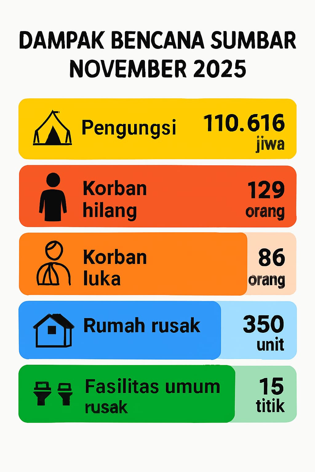 Infografis: 129 tewas, 86 hilang, 110.616 jiwa mengungsi akibat banjir bandang dan longsor di Sumbar, November 2025 (Infografik: DV/AI).