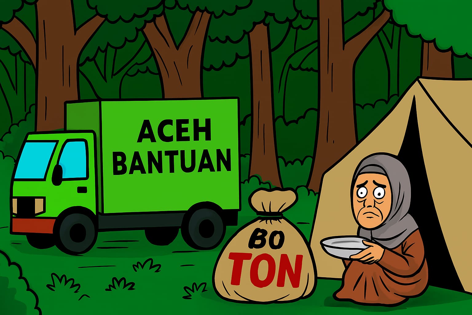 Truk bantuan tersesat di hutan, pengungsi tetap menunggu dengan perut kosong.(Ilustrasi: AI).