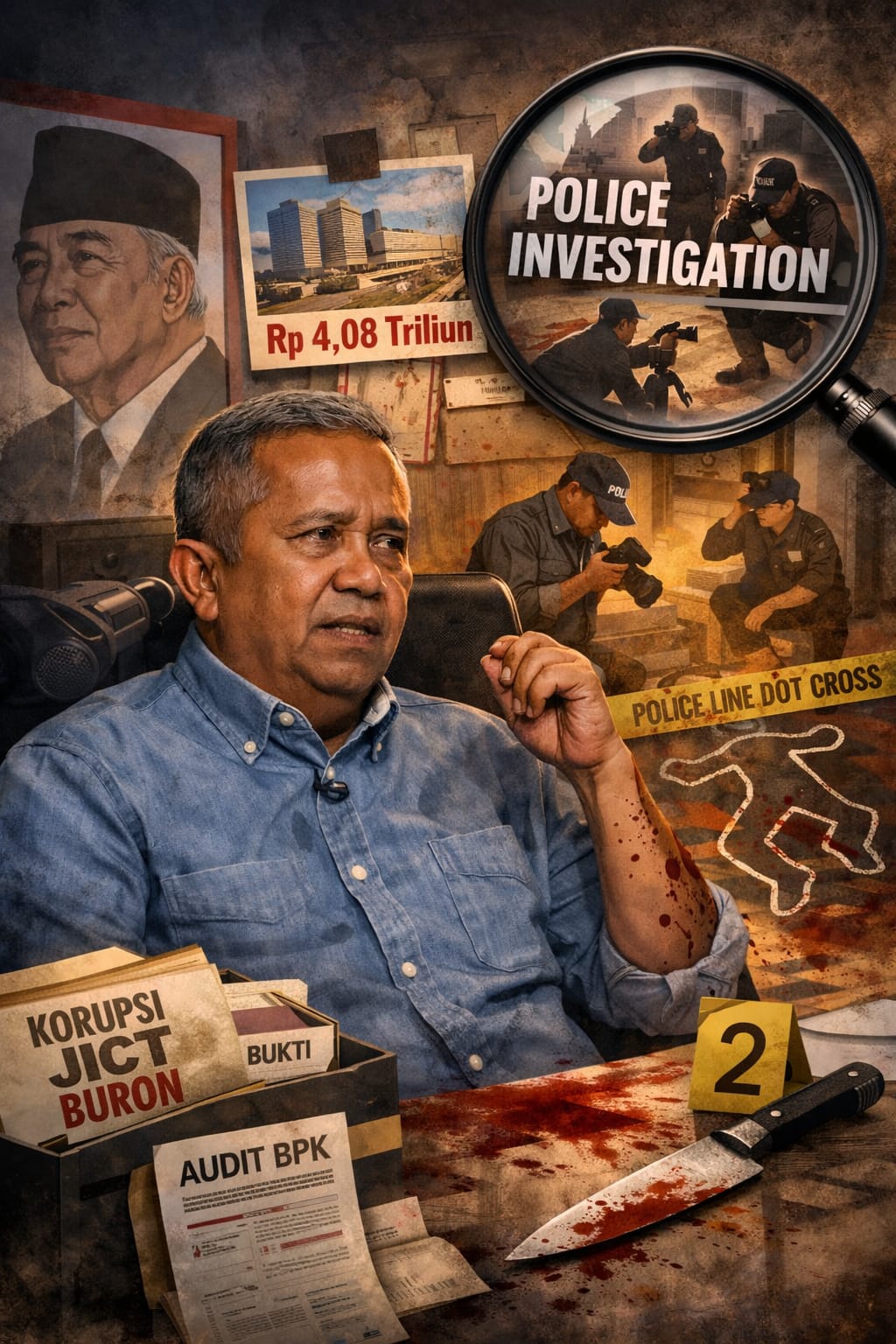 Ilustrasi kematian aktivis antikorupsi Ermanto Usman, menyoroti dugaan keterkaitan dengan kasus korupsi Rp4,08 triliun di JICT dan tuntutan publik atas transparansi penyelidikan.(Ilustrasi: Minakonews/AI).