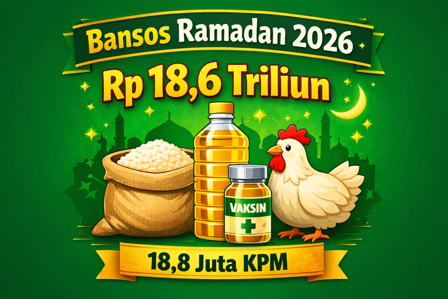 Ilustrasi bantuan sosial Ramadan 2026: Rp 18,6 triliun untuk 18,8 juta keluarga penerima manfaat. Simbol beras, minyak goreng, dan ayam mewakili paket bansos pangan yang disalurkan menjelang Idulfitri (Ilustrasi: Minakonews/AI).