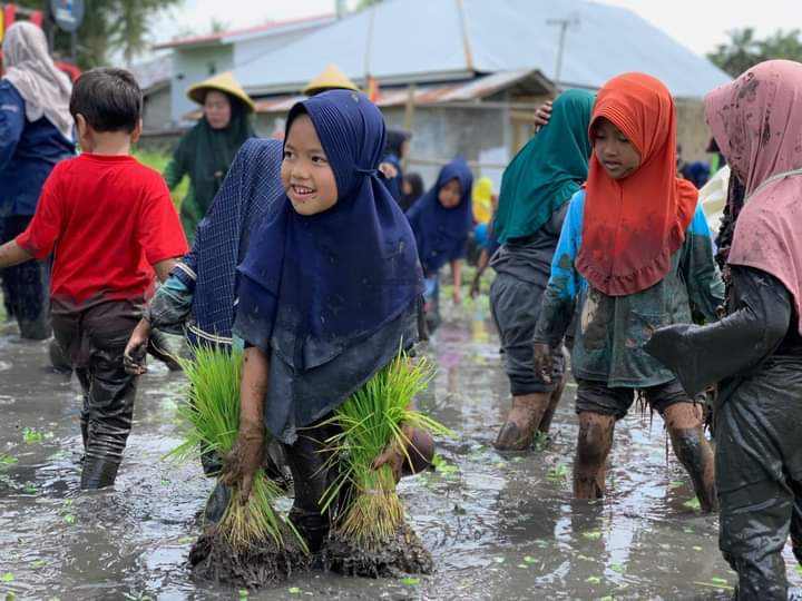 Wajah ceria, riang dan gembira tergambar dari raut sejumlah anak TK itu. Terlebih saat anak murid diajak untuk menanam padi, menangkap ikan dan bermain pacu upiah, karena saat itu anak-anak masuk lumpur dan bermain di area kotor.