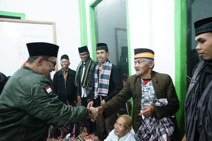 Bupati Tanah Datar Eka Putra disambut pengurus mesjid Baiturrahman Koto Alam Tabek Patah ketika menghadiri peringatan isra’mi’raj Nabi Muhammad SAW Jumat (27/01).(Foto : M. Syukur).