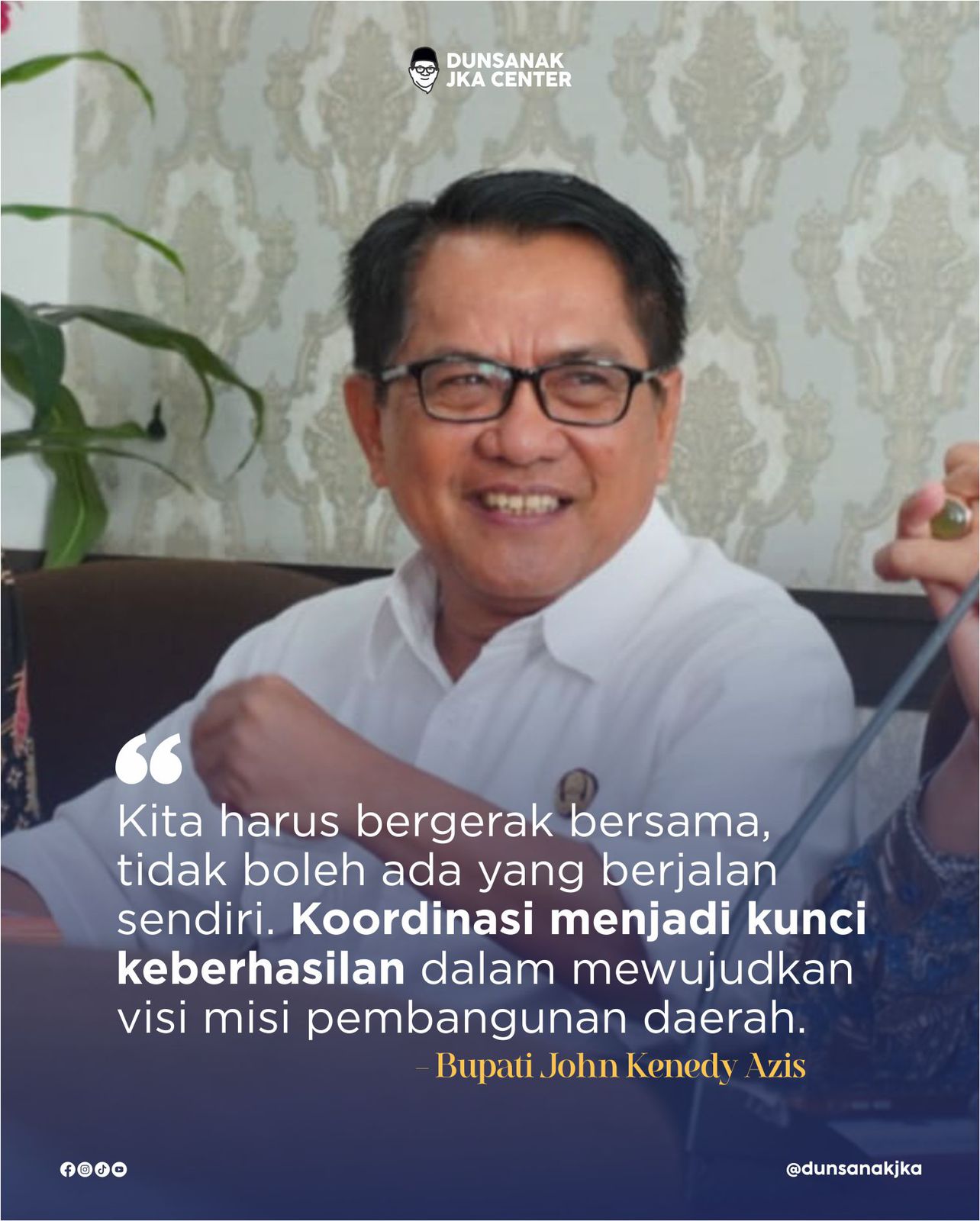 Sementara, untuk persatuan dan kesatuan, menurut JKA; perlunya pemahaman masyarakat akan realita yang dihadapi pemerintah kabupaten. Bahwa saat ini, tidak semua harapan masyarakat yang bisa diakomodir, termasuk visi dan misi JKA-Rahmat, juga belum semua dapat kita realisasikan. Inshaa Allah, seiring normalnya keuangan daerah, komitmen yang telah dijanjikan itu, akan kita wujudkan.