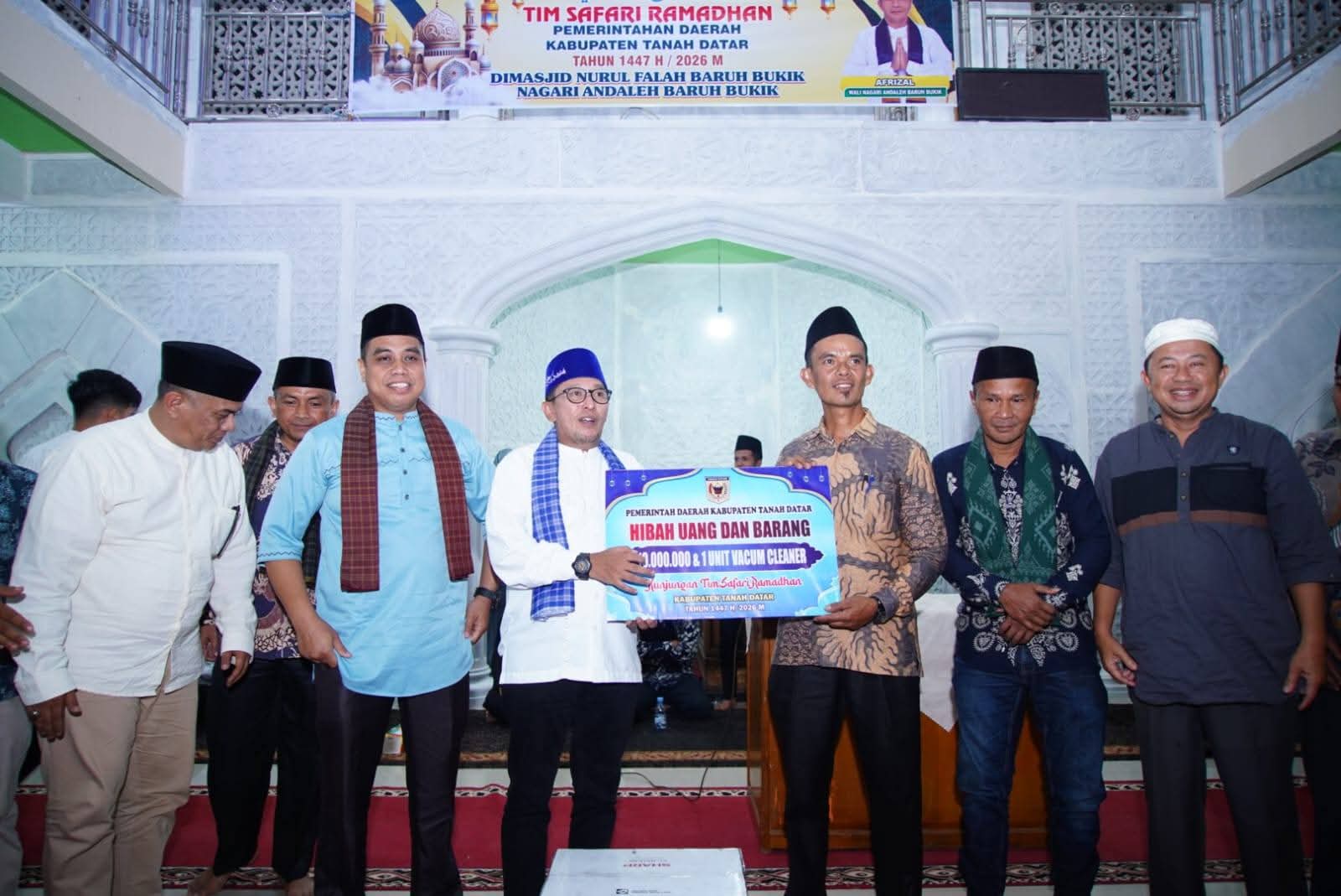 Bupati Tanah Datar Eka Putra terlihat menyerahkan bantuan hibah Masjid sebesar Rp. 10 juta.(MSR).