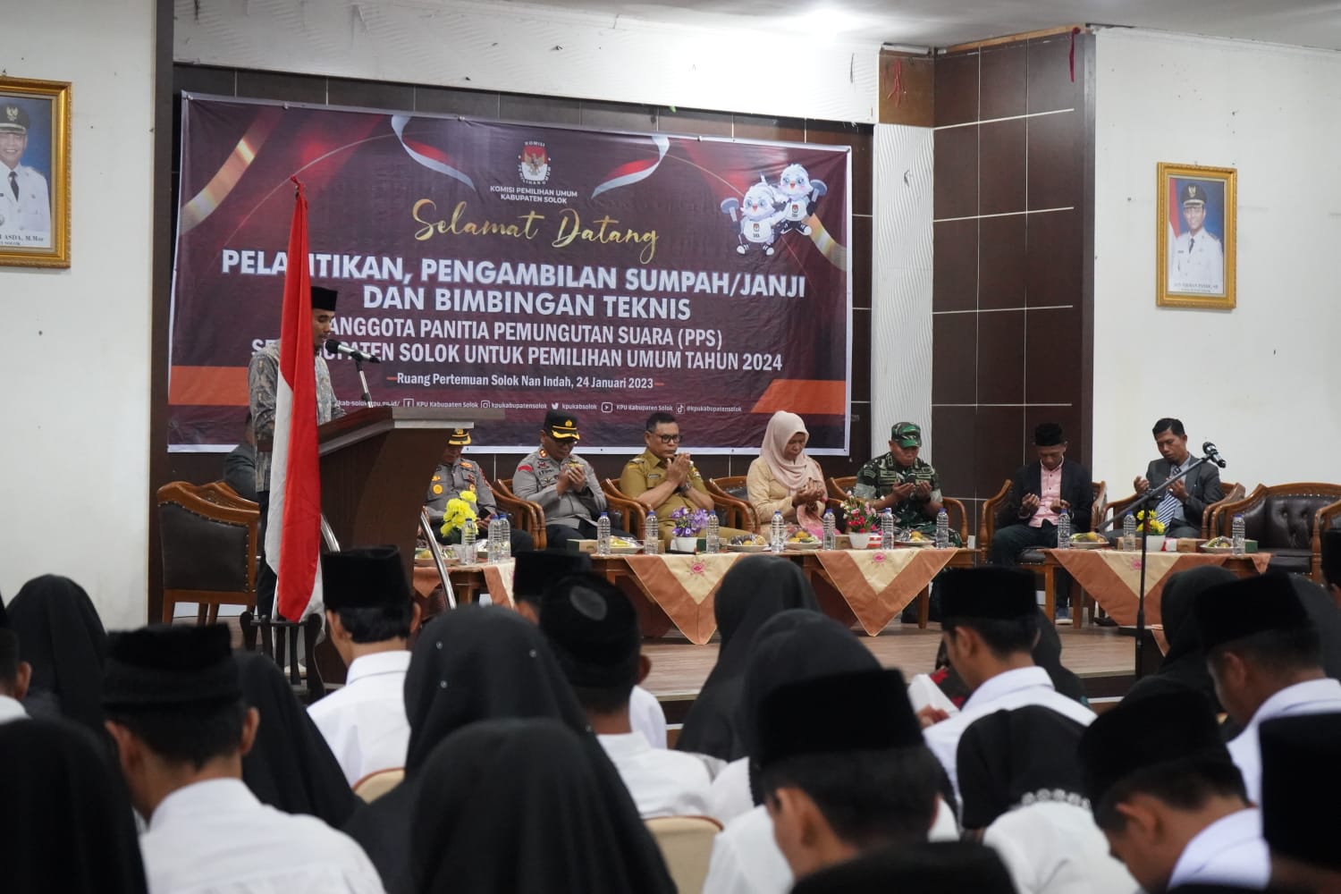 Solok (Sumbar) MINAKONEWS.COM – Bupati Solok Capt. H. Epyradi Asda Dt Sutan Majo Lelo, M.Mar hadiri Pelantikan, Pengambilan Sumpah/Janji dan Bimbingan Teknis Anggota Panitia Pemungutan Suara (PPS) Se-Kabupaten Solok untuk Pemilihan Umum Tahun 2024 di Gedung Solok Nan Indah Arosuka Selasa (24/01).
