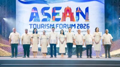 Delegasi ASEAN berfoto bersama di panggung utama ASEAN Tourism Forum 2026 di Cebu, Filipina, menegaskan…
