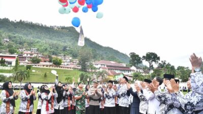 Pelepasan balon warna-warni meriahkan peringatan Hari Guru Nasional dan HUT ke-80 PGRI di Sawahlunto (Foto…