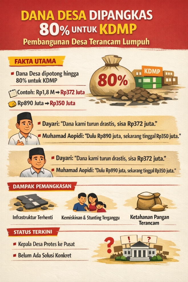 Dana Desa dipangkas 80 persen untuk KDMP. Anggaran menyusut, pembangunan desa terhenti, program kemiskinan dan stunting terganggu. (Infografis: Minakonews/AI).