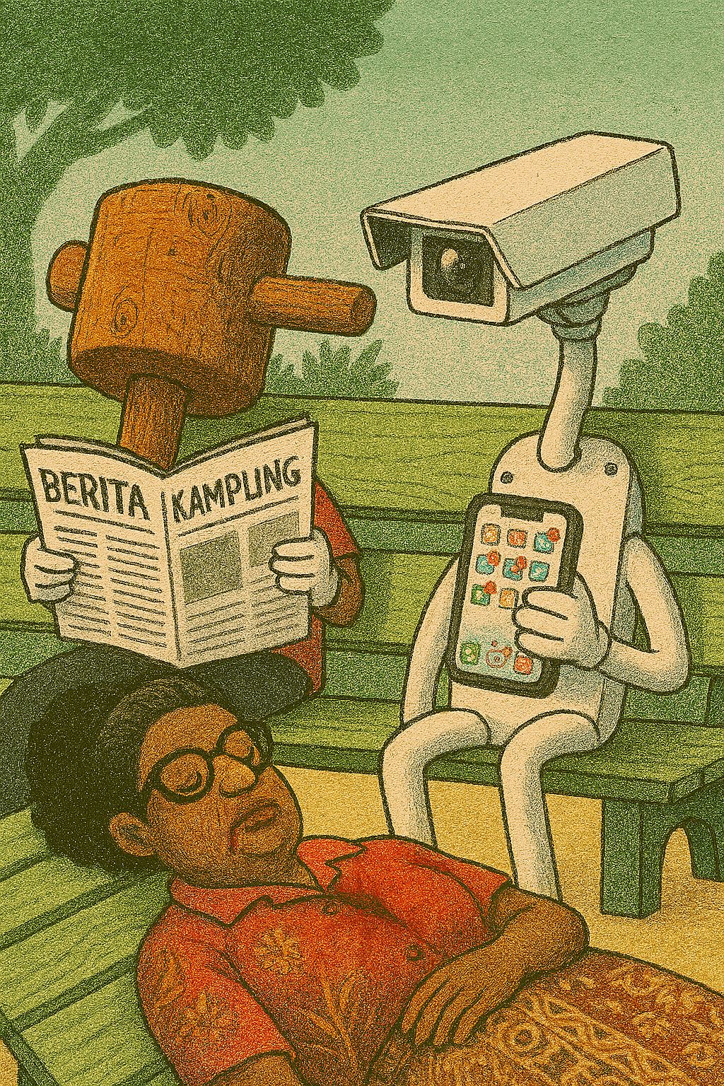 Kentongan baca koran, CCTV main HP, satire transisi keamanan nagari dari tradisi ke teknologi (Ilustrasi: d®amlis/AI).