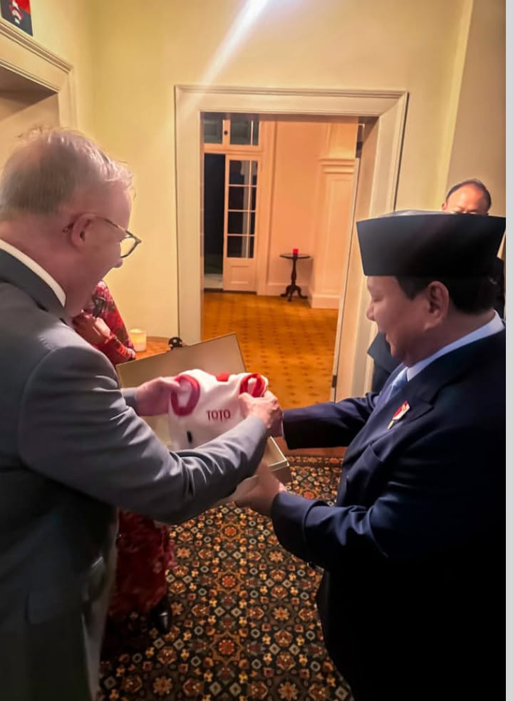 Presiden Prabowo menyerahkan hadiah bertuliskan “TOTO” kepada PM Australia Anthony Albanese sebagai simbol diplomasi hangat antarpemimpin.(Foto Dok. Sekkab).