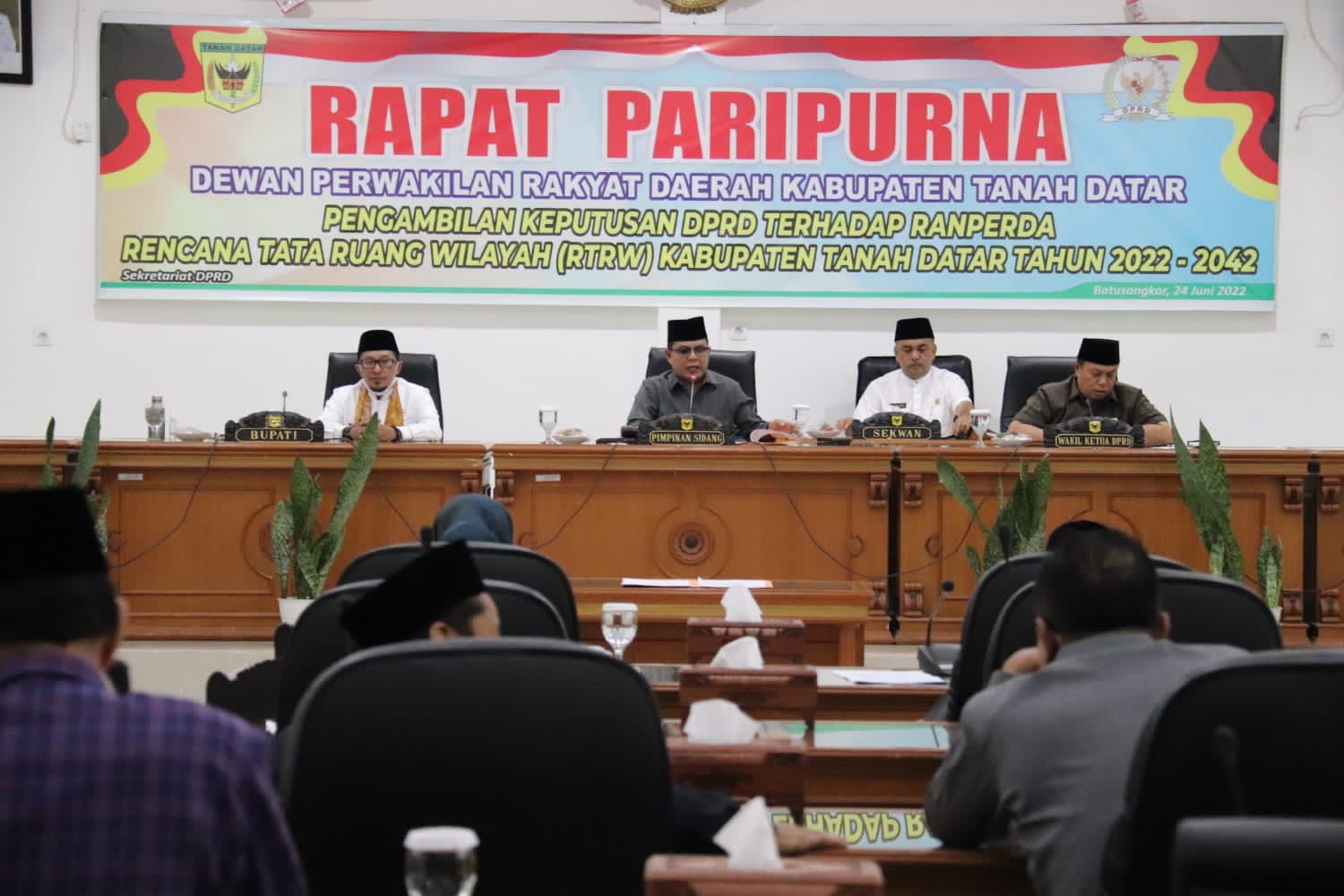 Tanah Datar (Sumbar), MINAKONEWS.COM-DPRD dan Bupati Tanah Datar setujui Ranperda Rencana Tata Ruang Wilayah (RTRW) Kabupaten Tanah Datar Tahun 2022-2042, ditetapkan menjadi Perda di ruangan rapat DPRD Tanah Datar Jumat (24/06).