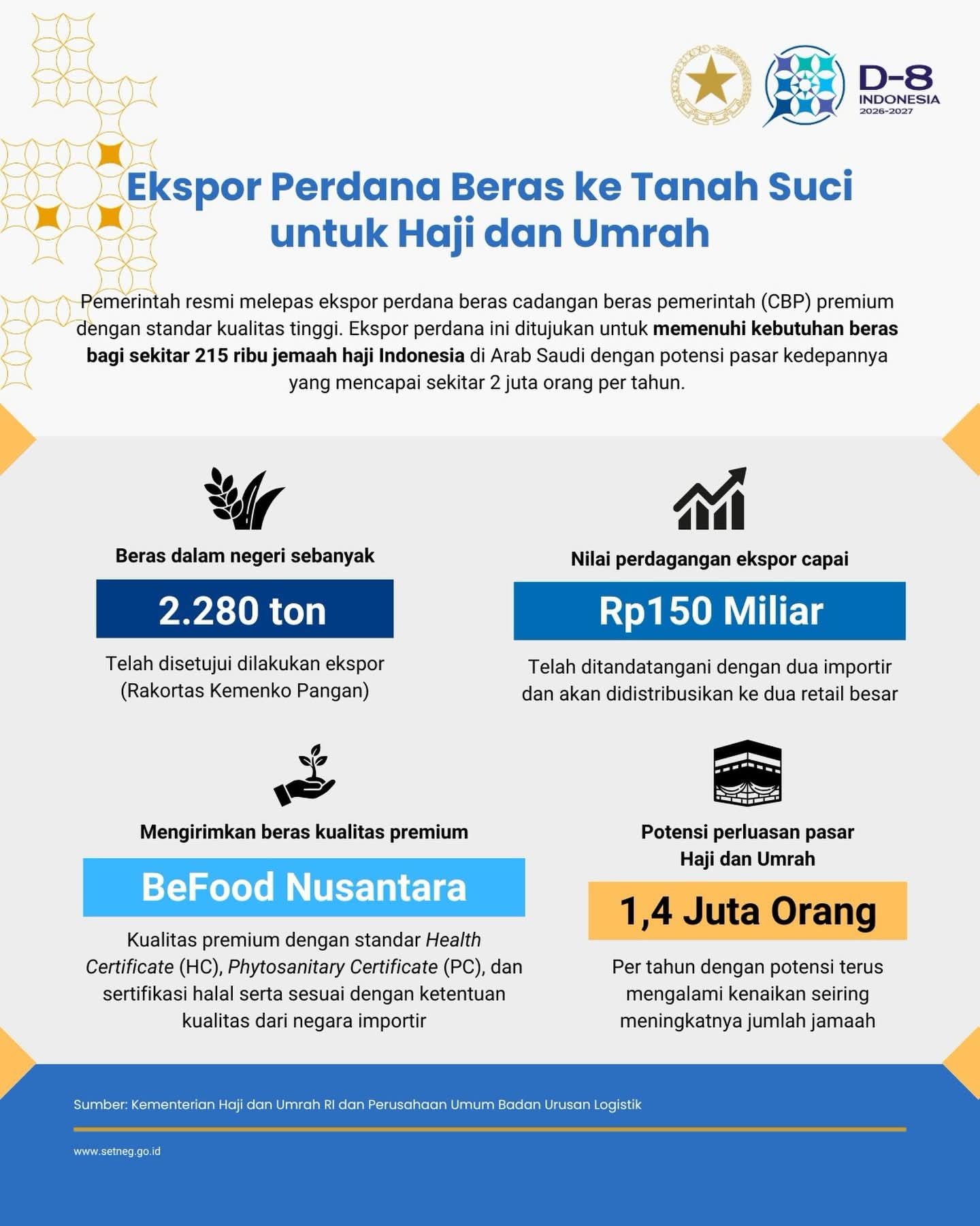 Pemerintah resmi melepas ekspor perdana beras Cadangan Beras Pemerintah (CBP) premium sebanyak 2.280 ton ke Arab Saudi, Jumat (07/03/2026). Ekspor ini ditujukan untuk memenuhi kebutuhan konsumsi sekitar 215 ribu jemaah haji Indonesia di Tanah Suci, sekaligus menjadi tonggak penting kebangkitan dan kemandirian pangan nasional.