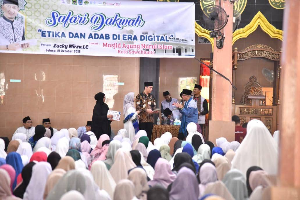 Safari Dakwah bersama Ustadz Zacky Mirza di Masjid Agung Nurul Islam, Sawahlunto, mengangkat tema “Etika dan Adab di Era Digital” dalam rangka wirid gabungan Pemko dan BKMT, Selasa, 21/10/2025 (Foto: Prokopim).