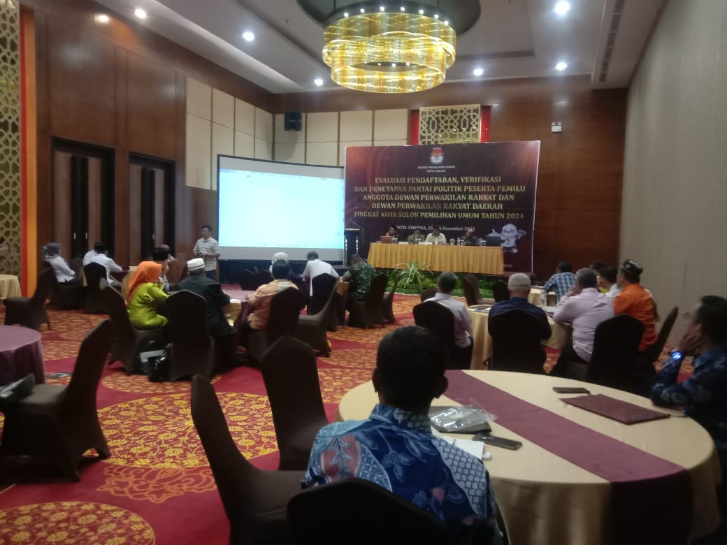Tanah Datar (Sumbar), MINAKONEWS.COM – kegiatan evaluasi pendaftaran verifikasi dan penetapan partai politik peserta pemilu anggota Dewan Perwakilan Rakyat (DPR) dan Dewan Perwakilan Rakyat Daerah (DPRD) tingkat Kota Solok, Pemilihan Umum tahun 2024 di gelar oleh KPU Kota Solok di Emersia Hotel Batusangkar Senin (26/12) berjalan lancar dan di tutup oleh Ketua KPU Asraf Danil .