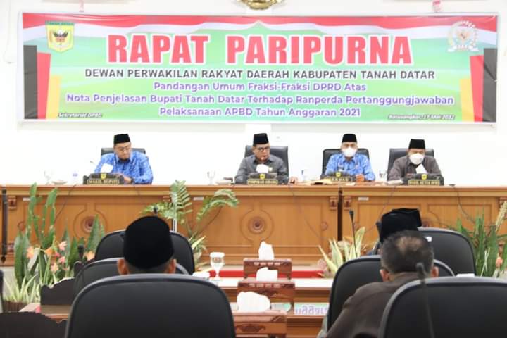Tanah Datar (Sumbar), MUNAKONEWS.COM- Dewan Perwakilan Rakyat Daerah (DPRD) Tanah Datar menggelar Sidang Paripurna dalam rangka Pemandangan Fraksi-fraksi terhadap penyampaian Ranperda Laporan Pertanggungjawaban APBD Anggaran 2021 oleh Bupati Tanah Datar di ruang sidang utama DPRD Selasa (17/05).