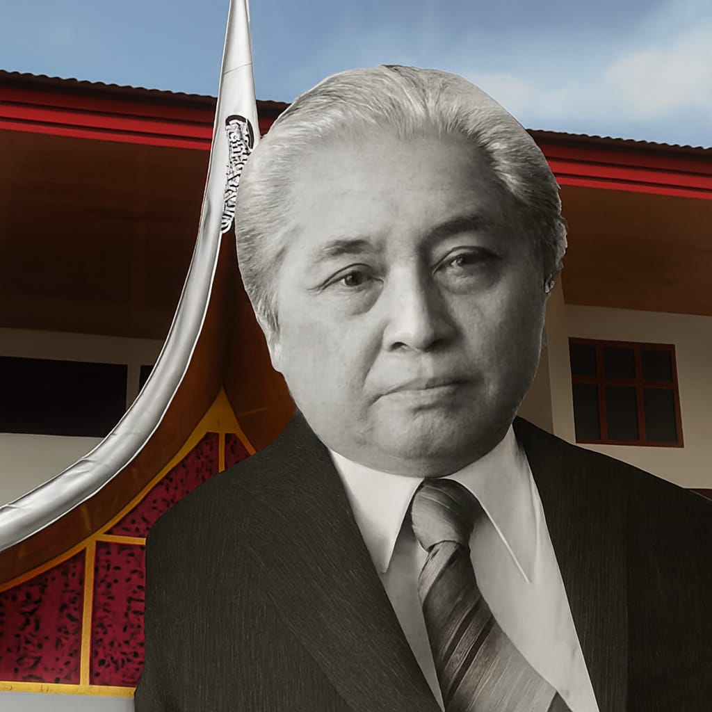 Potret Abdullah Kamil berdampingan dengan Gedung yang menyandang namanya—warisan diplomasi Minangkabau kini berpadu dengan arah baru kebudayaan Sumbar.(Dok. Minakonews/AI).