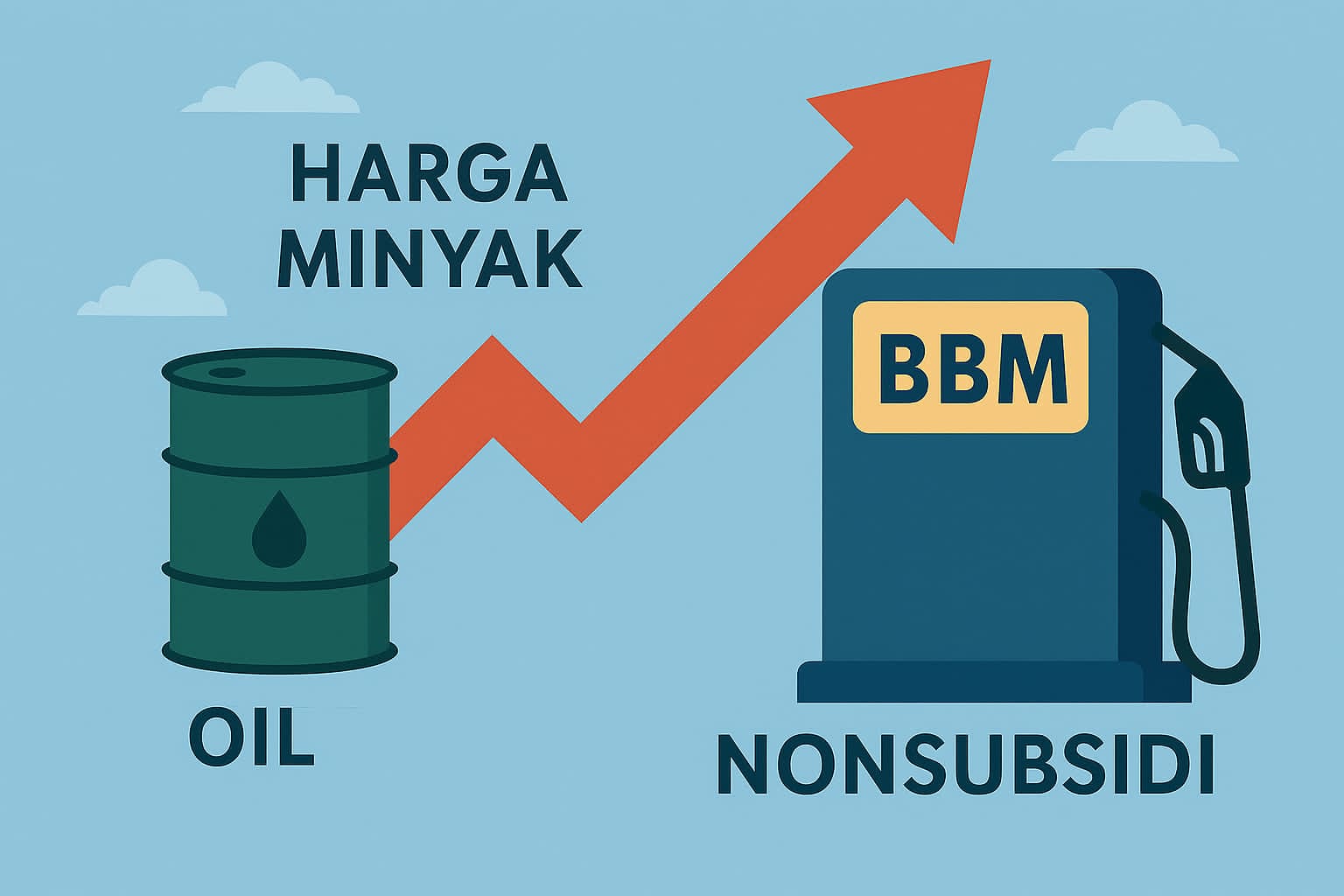 Ilustrasi dampak lonjakan harga minyak dunia terhadap BBM nonsubsidi di Indonesia, digambarkan dengan grafik panah merah menanjak, simbol barel minyak, dan pompa bensin. (Ilustrasi: Minakonews/AI).