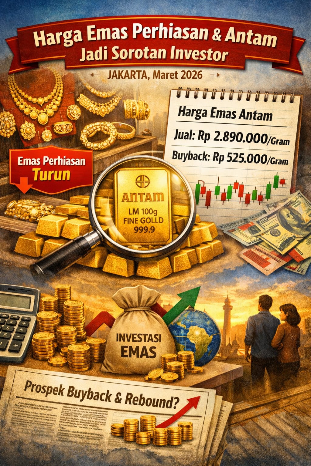 Jakarta, MINAKONEWS – Pergerakan harga emas dalam 24 jam terakhir menjadi perhatian publik. Harga emas perhiasan di sejumlah toko besar tercatat menurun, sementara harga emas Antam (ANTM) relatif stabil di Rp2,89 juta per gram. Kondisi ini membuat investor fokus pada tren buyback dan potensi rebound.