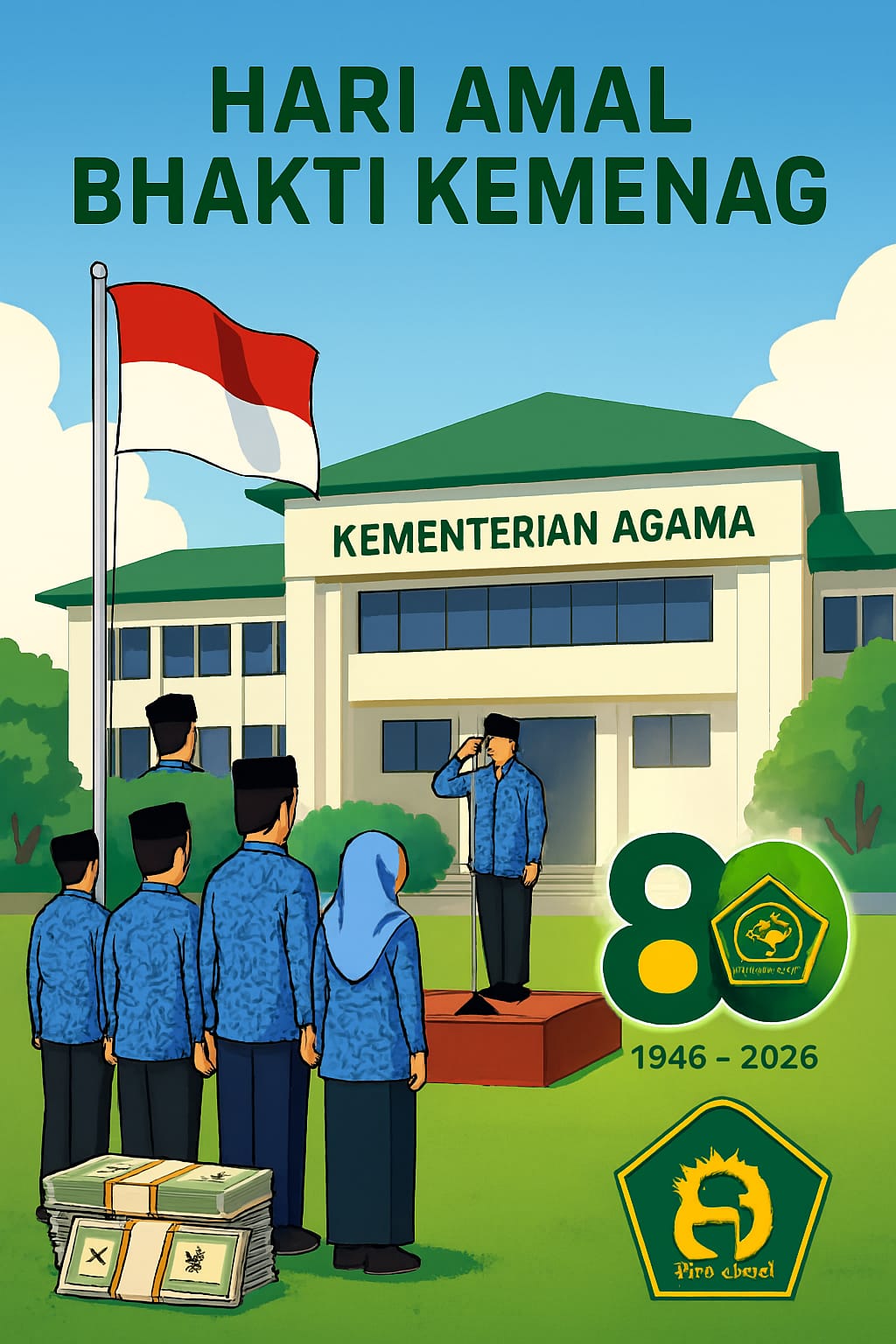 ASN mengikuti upacara Hari Amal Bhakti Kemenag ke-80 di halaman kantor Kementerian Agama. (Infografis: HT/AI).