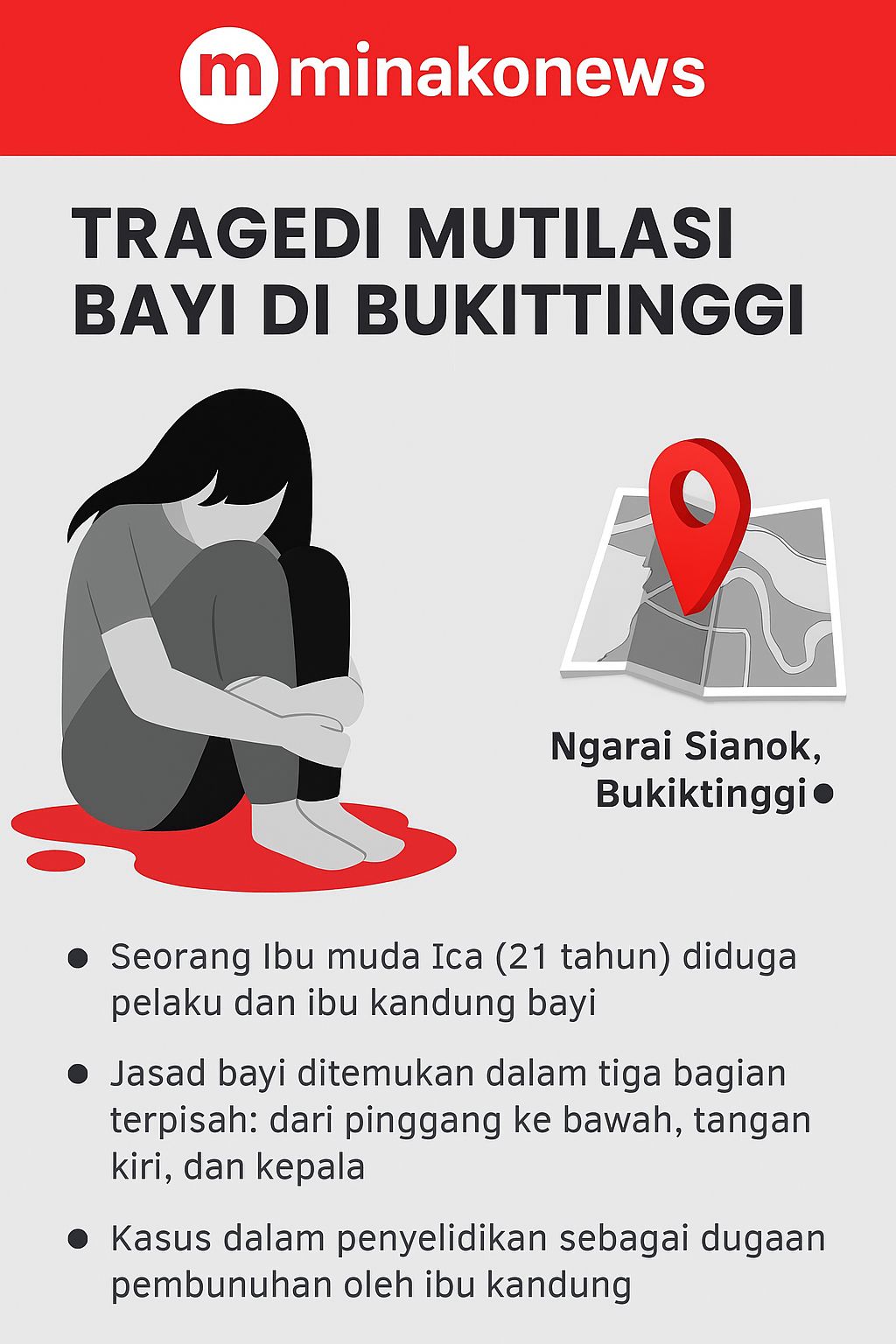 Tragedi Bukittinggi: Seorang ibu muda diduga mutilasi bayi kandungnya. Jasad ditemukan terpotong di Ngarai Sianok. Polisi selidiki motif dan kondisi psikologis pelaku. #Minakonews #Bukittinggi #TragediNgaraiSianok (Infografis: d®amlis/AI).