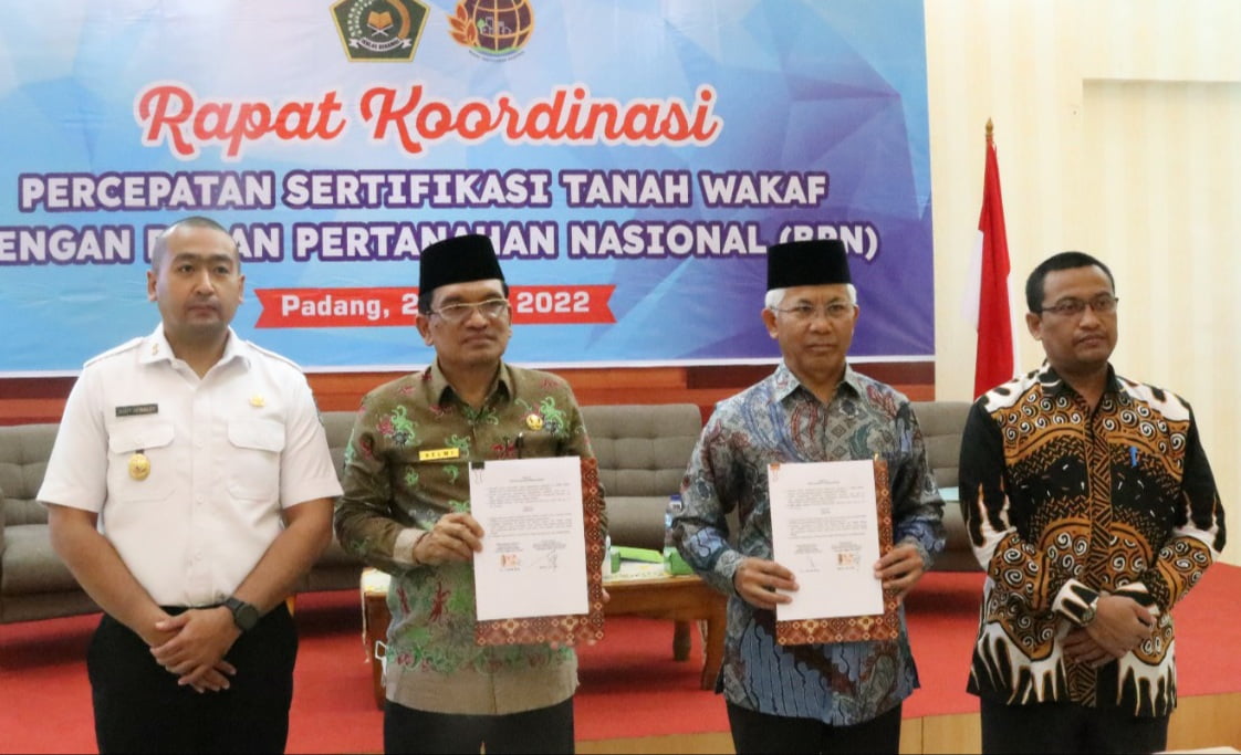 Terkait hal itu, disaksikan Wagub Sumbar Audy Joinaldy dan Kepala Biro Hukum dan Kerjasama Luar Negeri Kemenag RI Ahmad Bahiej, Kakanwil Kemenag Sumbar H. Helmi melakukan penandatanganan MoU dengan Kakanwil BPN Sumbar, Saiful disela rapat koordinasi di Aula Kanwil BPN Sumbar baru-baru ini.