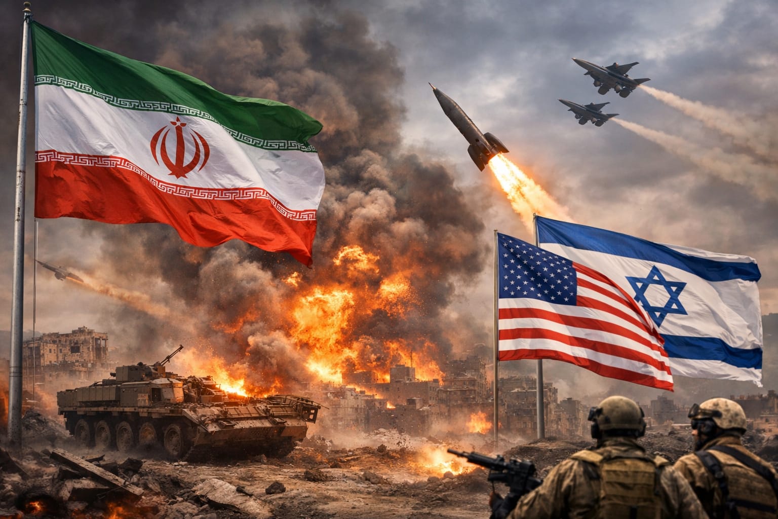 Ilustrasi konflik militer antara Amerika Serikat dan Israel melawan Iran yang memanas sejak akhir Februari 2026, dengan latar ledakan, rudal, dan bendera negara yang terlibat.(Ilustrasi: Minakonews/AI).
