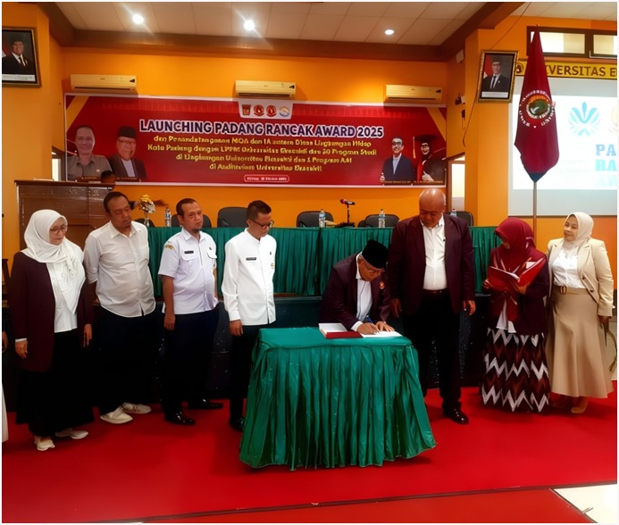 Padang (Sumatera Barat). MINAKONEWS.COM — Universitas Ekasakti (Unes) menjadi tuan rumah peluncuran program Padang Rancak Award 2025 yang dirangkaikan dengan penandatanganan MoA dan IA antara Dinas Lingkungan Hidup (DLH) Kota Padang dengan LPPM Unes, 20 Program Studi di lingkungan Unes, serta 1 Program Studi dari Akademi Akuntansi Indonesia (AAI), Rabu (29/10) di Auditorium Unes.