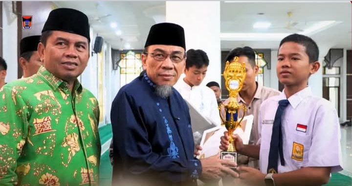 Wakil Wali Kota Padang, Maigus Nasir, menyerahkan trofi juara kepada salah satu siswa peserta Pesantren Ramadan Khusus tingkat SMP/MTs se-Kota Padang di Masjid Agung Nurul Iman, Minggu, 15/3/2026. (Foto Dok. Humas).