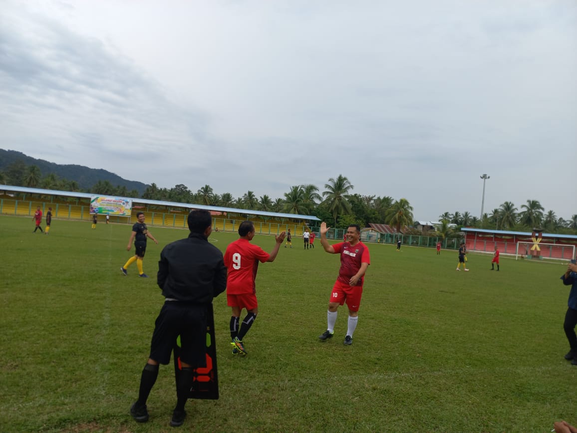 Dengan mengenakan costum merah bergaris Hitam Bupati Epyardi dengan posisi sayap kiri, mencoba mengolah bola dengan baik.namun sang Bupati Sijunjung Benny Dwifa dengan costum serba hitam juga ikut memperkuat tim kesayangannya.