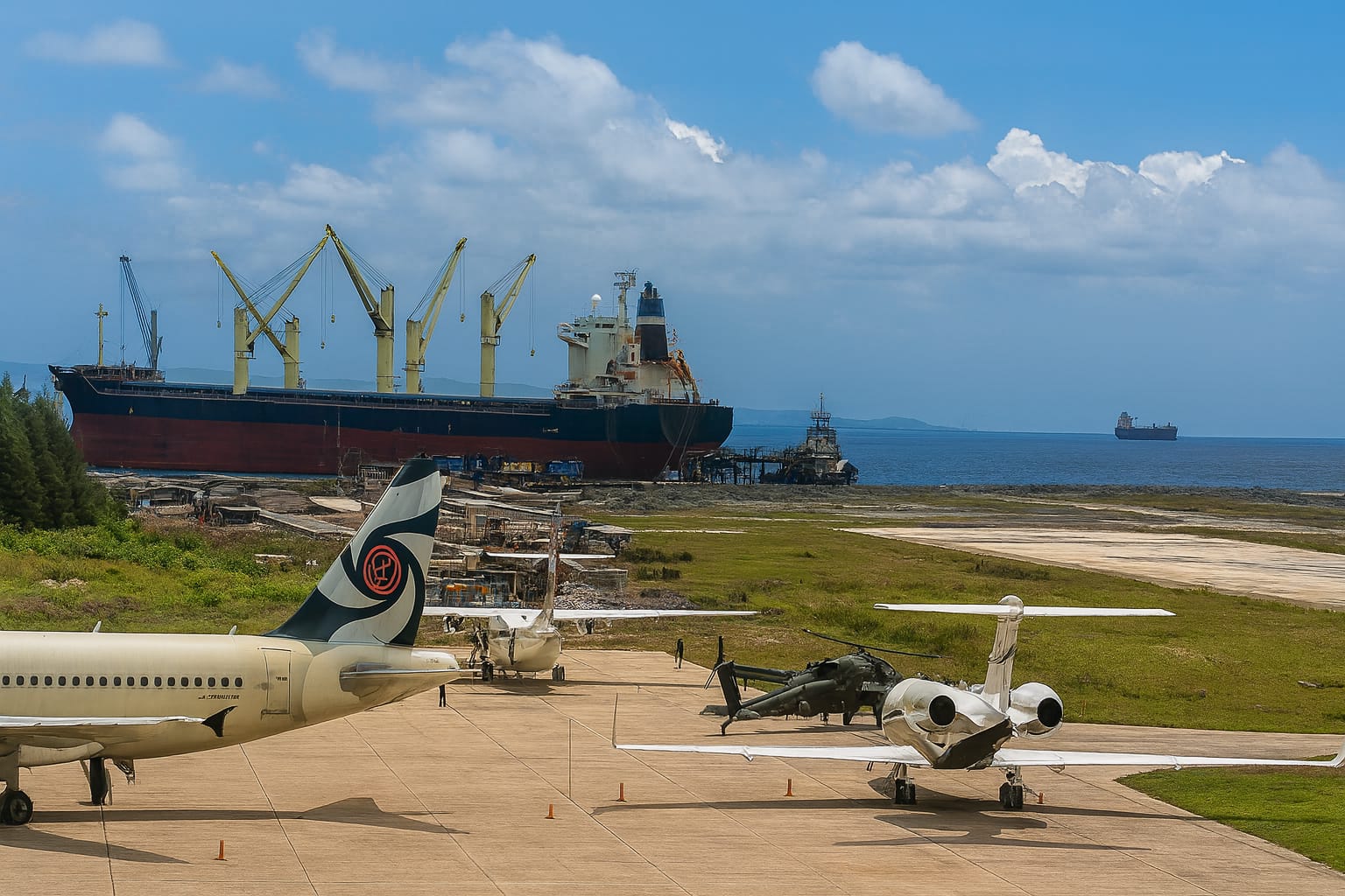 Ilustrasi suasana pelabuhan industri PT IWIP di Halmahera Tengah, menampilkan kapal kargo tengah bongkar muat kontainer dengan dukungan derek dan fasilitas pesisir.(Ilustrasi: WD/AI).