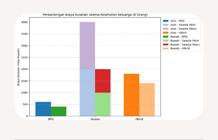 Simulasi ilustratif menunjukkan perbedaan biaya bulanan keluarga kelas menengah atas dan bawah. Untuk menengah atas, BPJS Kelas 1 Rp600.000 per bulan, asuransi swasta Rp2.000.000–Rp4.000.000, dan skema hibrid Rp1.800.000. Sementara menengah bawah, BPJS Kelas 2 Rp400.000, asuransi swasta basic Rp1.000.000–Rp2.000.000, dan hibrid Rp1.400.000.