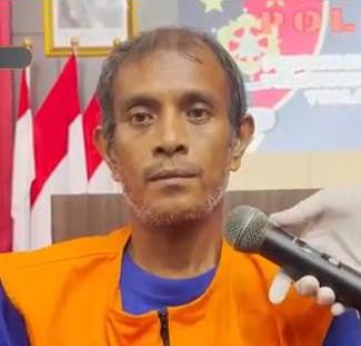 Tersangka kasus pembunuhan di Perawang Barat saat konferensi pers di Mapolres Siak. Ia mengenakan rompi tahanan dan memberikan keterangan di hadapan awak media (Sumber gambar: tangkapan layar dari video publikasi media).