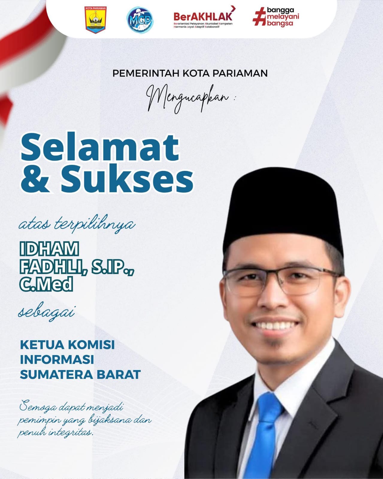 Pemerintah Kota Pariaman menyampaikan selamat atas pelantikan Idham Fadhli, seraya berharap kepemimpinan baru ini membawa integritas, kebijaksanaan, dan komitmen dalam menjalankan amanah keterbukaan informasi.