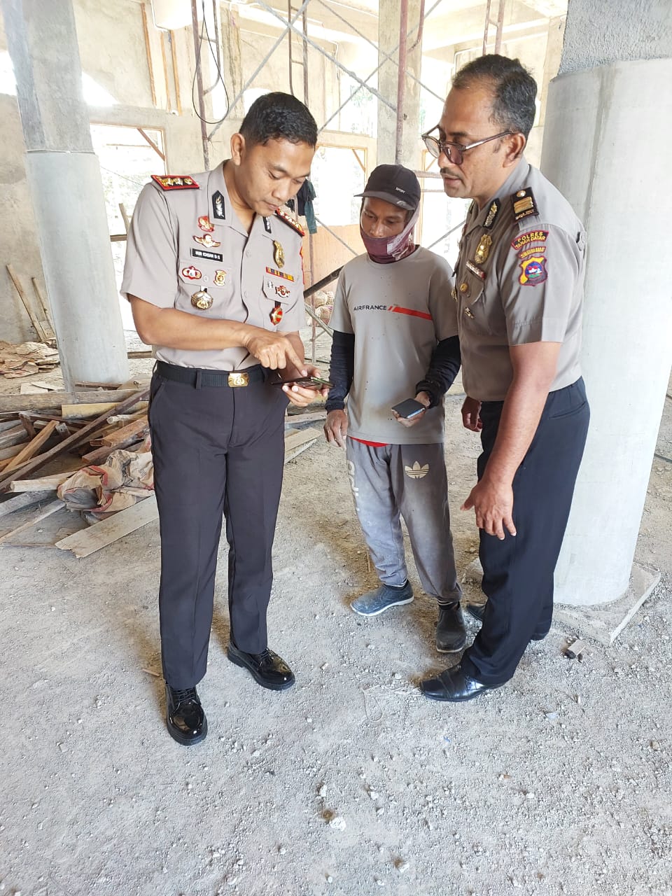 Kapolres Tanah Datar Dr.Nur Ichsan kiri terlihat memberikan petunjuk kepada tukang (ditengah) didampingi Ketua pelaksana pembangunan rumah ibadah itu AKP Kamaluddin sebelah kanan.(Foto : Datuok).