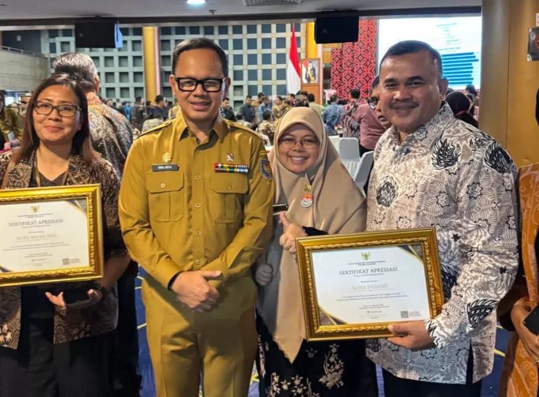 Plt. Sekda Kota Padang Raju Minropa menerima penghargaan dari BRIN atas capaian Indeks Daya Saing Daerah (IDSD) tertinggi tahun 2025, menegaskan komitmen Pemko Padang dalam tata kelola responsif dan penguatan inovasi daerah.(Foto Dok. Diskominfo).