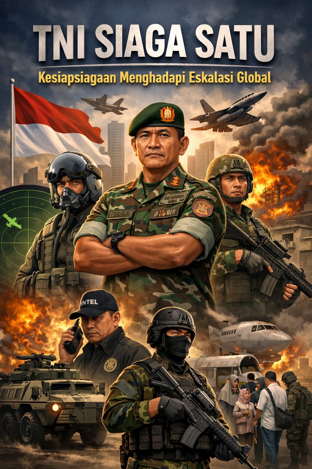 Ilustrasi kesiapsiagaan penuh TNI dalam status Siaga Satu, menampilkan Panglima TNI bersama pasukan dan alutsista strategis menghadapi eskalasi global (Ilustrasi: Minakonews/AI).