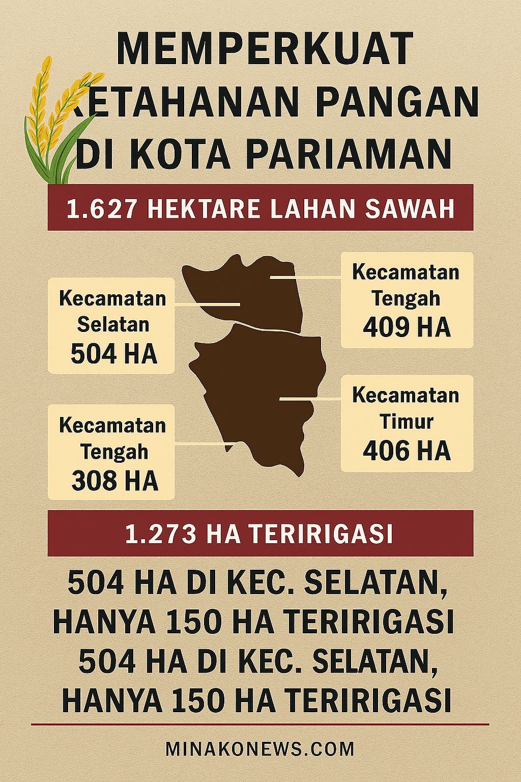 Distribusi lahan sawah dan irigasi di Kota Pariaman: 1.627 hektare tersebar di empat kecamatan, dengan 1.273 hektare telah teririgasi. Kecamatan Selatan punya lahan terluas, tapi irigasi paling minim (Infografis: 44d1n0/AI).