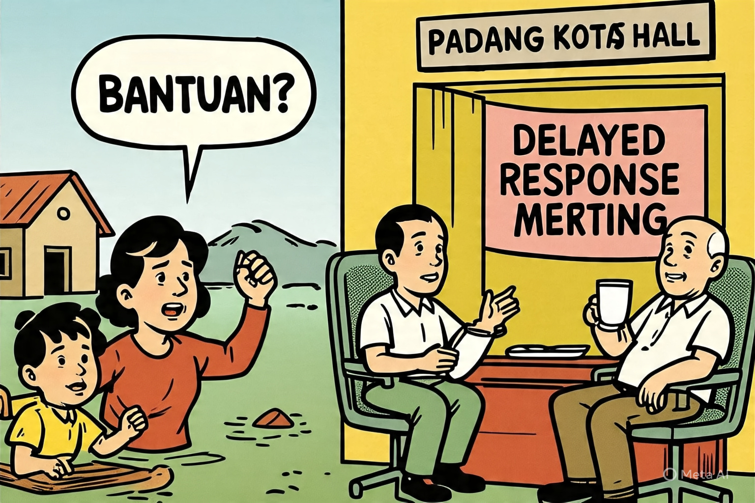 Warga terendam lumpur, pejabat tenggelam dalam rapat (Ilustrasi: AI).