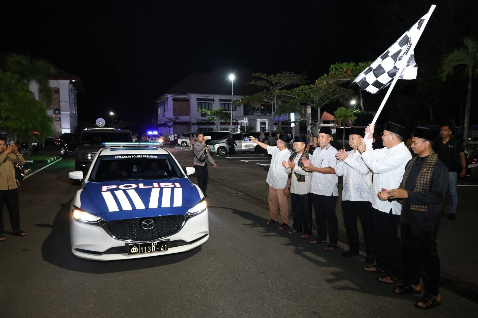 Wali Kota Pariaman bersama jajaran melepas takbiran keliling Idul Fitri 1447 H dengan pengibaran bendera start di depan mobil patroli Satlantas Polres Pariaman.(Foto Dok. MCK).