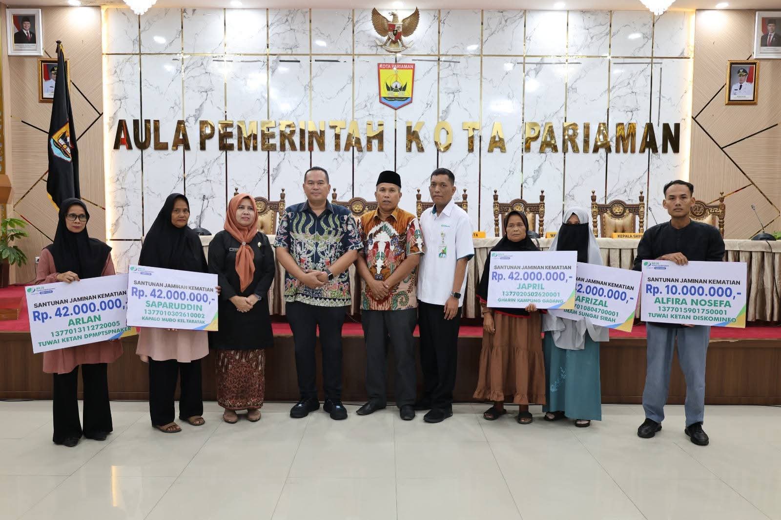 Walikota Pariaman Yota Balad bersama Wakil Walikota Mulyadi menyerahkan santunan Jaminan Kematian kepada ahli waris peserta BPJS Ketenagakerjaan. (Foto Dok. MCK).