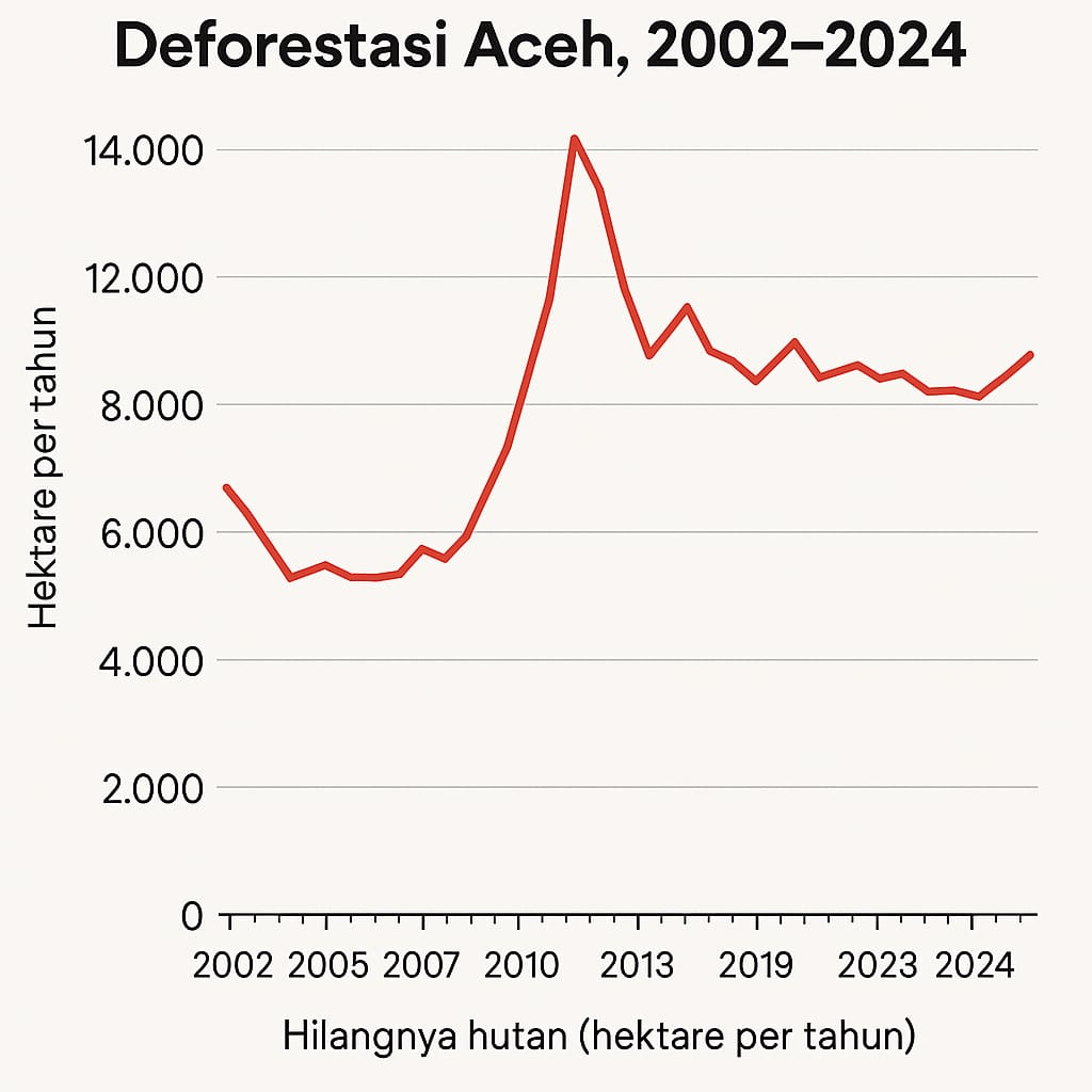 Aktivitas tersebut berkontribusi pada deforestasi tahunan yang mencapai 8.962 hektare pada 2024, menjadikan Aceh sebagai salah satu provinsi dengan kehilangan hutan tertinggi di Indonesia.