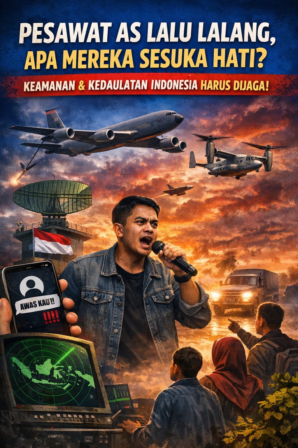 Pesawat militer Amerika melintas di langit Indonesia memunculkan keresahan rakyat. Kedaulatan udara harus dijaga demi keamanan nasional.(Ilustrasi: Minakonews/AI).