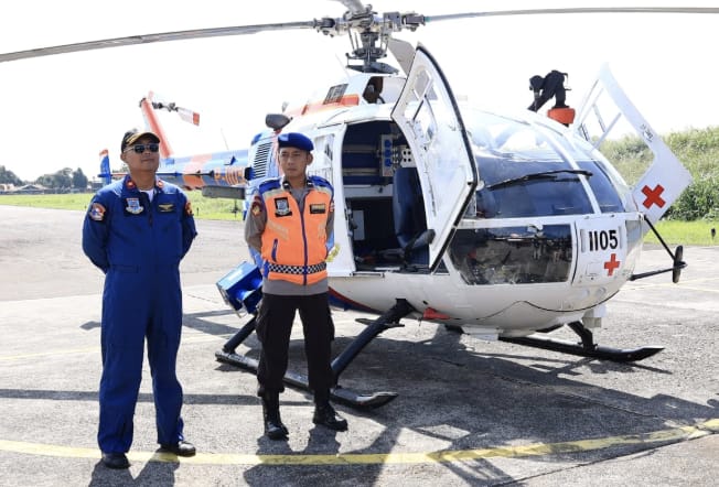 Personel Polri dan tim medis berdiri siaga di depan helikopter evakuasi berlogo palang merah, menandai kesiapan operasi udara dalam penanganan bencana di Sumut (Foto Dok. Divhumas Polri).