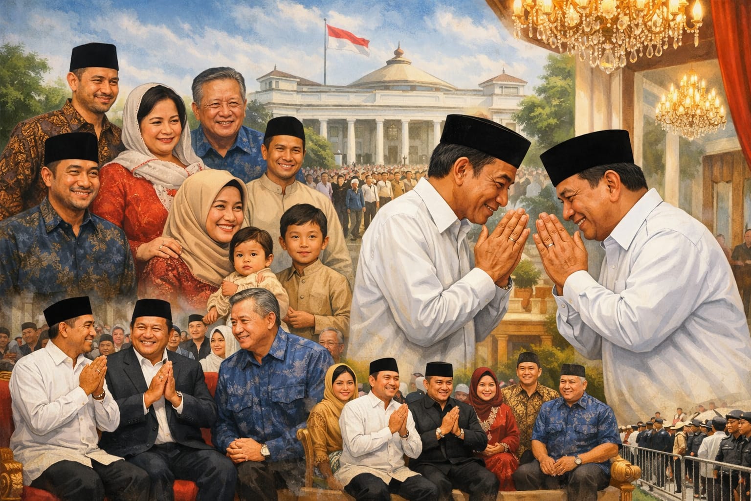 Momen hangat antara Prabowo dan Jokowi di Istana Gambir menjadi sorotan publik, menandai semangat rekonsiliasi dan kebersamaan nasional di Hari Raya Idul Fitri 1447 H.