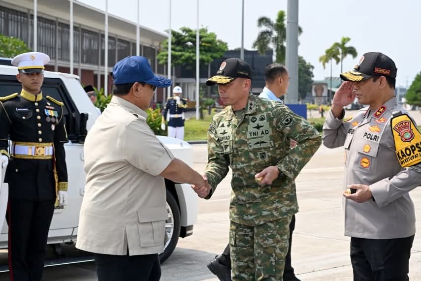 Presiden Prabowo Subianto bersalaman dengan prajurit TNI AD saat tiba di Medan, Sumatera Utara, Jumat (20/3/2026), sebelum melanjutkan perjalanan ke Aceh Tamiang untuk melaksanakan Salat Idul Fitri 1447 H bersama masyarakat.(Foto Dok. Setpres).
