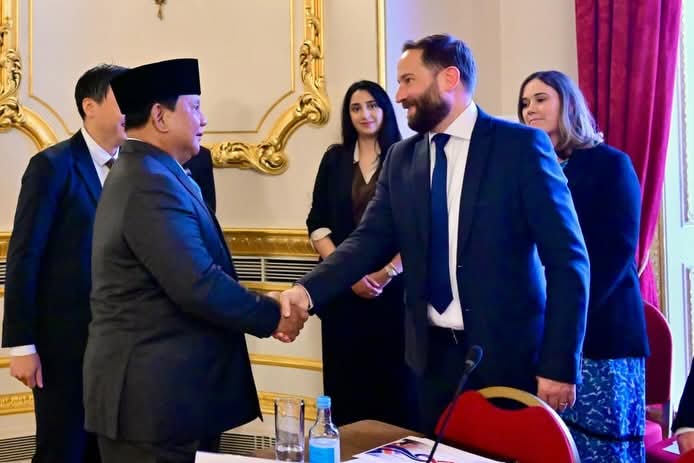 Presiden RI Prabowo Subianto berjabat tangan dengan perwakilan akademisi Inggris dalam forum UK–Indonesia Education Roundtable di Lancaster House, menegaskan komitmen kerja sama pendidikan dan pengembangan sumber daya manusia.(Foto Dok. Setpres).