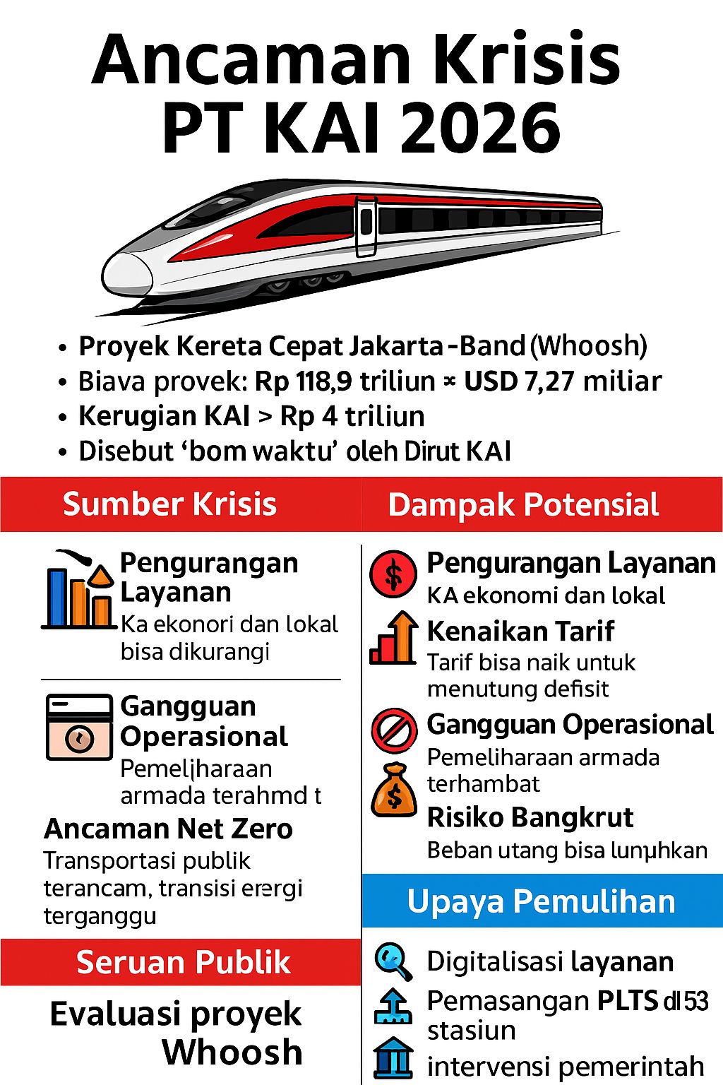 Proyek Whoosh jadi bom waktu: PT KAI terancam krisis, publik tuntut transparansi (Infografis: DRJ/AI).