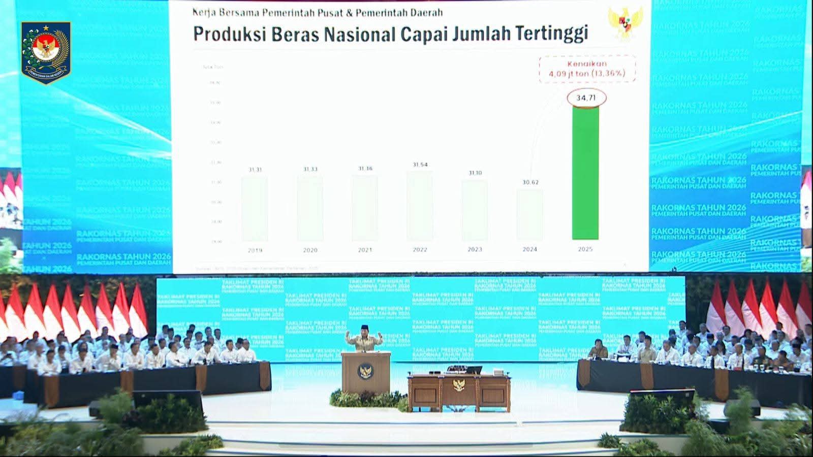 Presiden Prabowo juga memaparkan capaian sektor pangan nasional yang menunjukkan tren positif. Produksi beras nasional pada 2025 mencapai angka tertinggi sebesar 34,71 juta ton, mencerminkan sinergi kuat antara pemerintah pusat, pemerintah daerah, dan petani di seluruh Indonesia.
