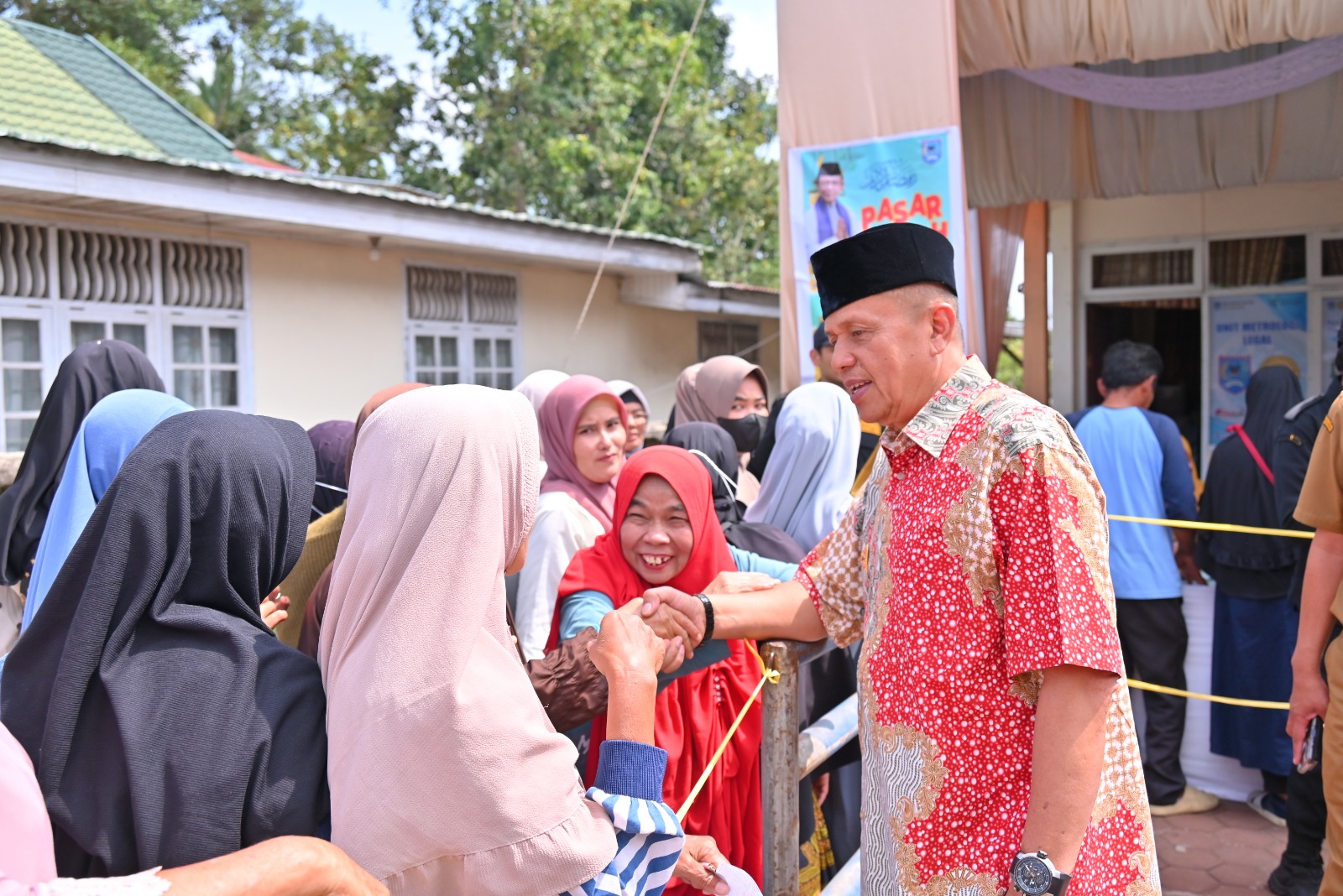 Wawako Elzadaswarman tengah menyalami Ratusan masyarakat disaat menyerbu Pasar Murah di Kantor Dinas Koperasi & UKM Kota Payakumbuh.( Foto : Herym )