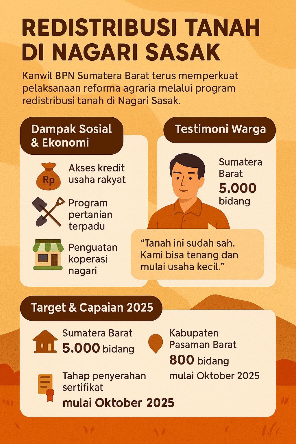 Target redistribusi tanah di Sumatera Barat tahun 2025 mencapai 5.000 bidang, dengan Pasaman Barat menyumbang 800 bidang. Penyerahan sertifikat dijadwalkan mulai Oktober 2025, menyasar nagari-nagari yang belum terdaftar dalam sistem pertanahan nasional.